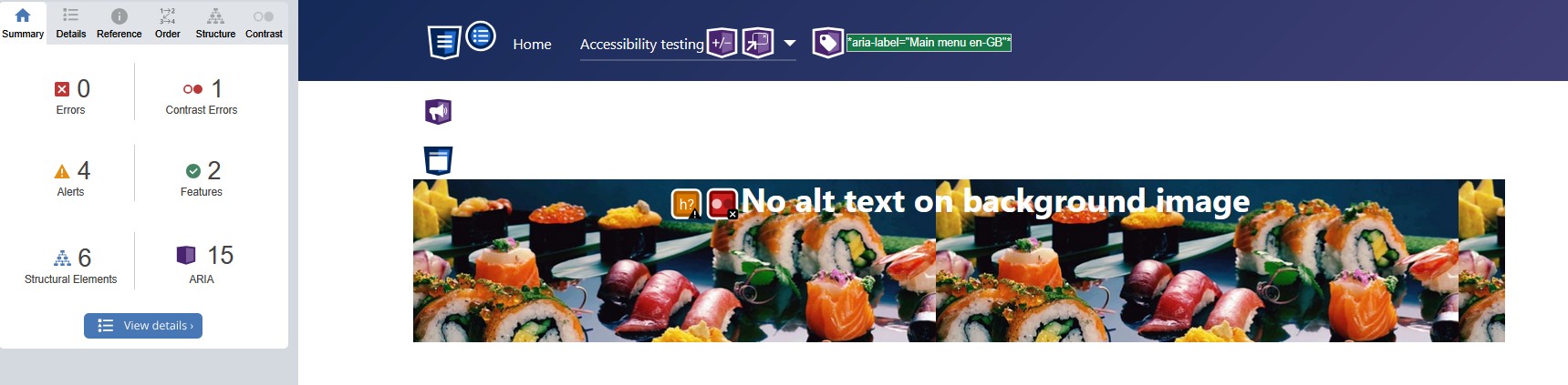 But the missing alt-text was not recognised. The usage of background images must be restricted to really “decorative images”.